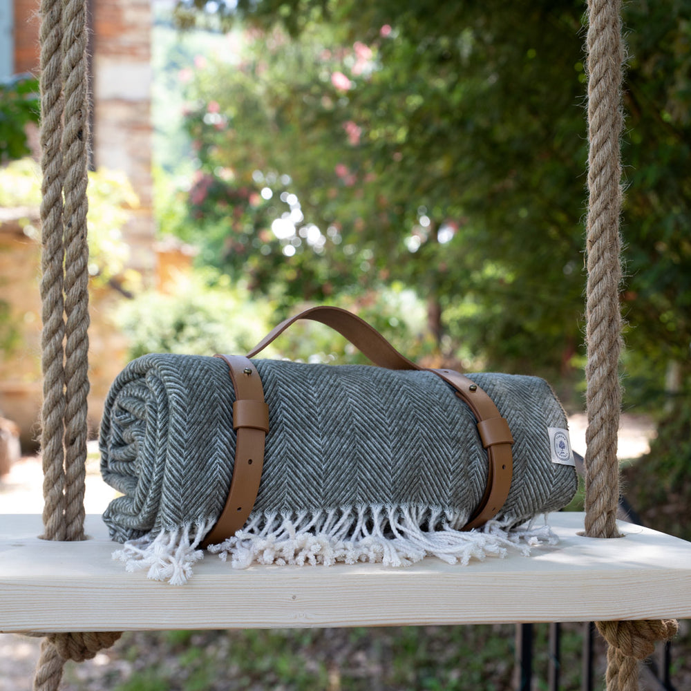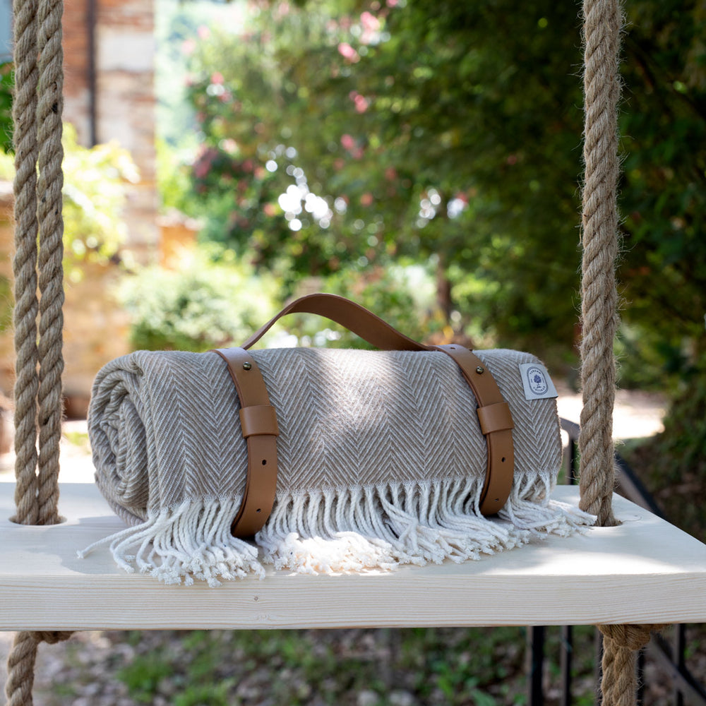 Realizzata con i migliori filati riciclati, in una composizione di 70% cotone, 25% poliammide e 5% poliestere, questa coperta è incredibilmente morbida e delicata sulla pelle. L'elegante motivo a spina di pesce è completato da una fibbia vegana, rendendola elegante, ecologica e rispettosa dell'ambiente. È perfetta per serate rilassanti a casa o per aggiungere un tocco di raffinatezza all'arredamento della vostra casa.
