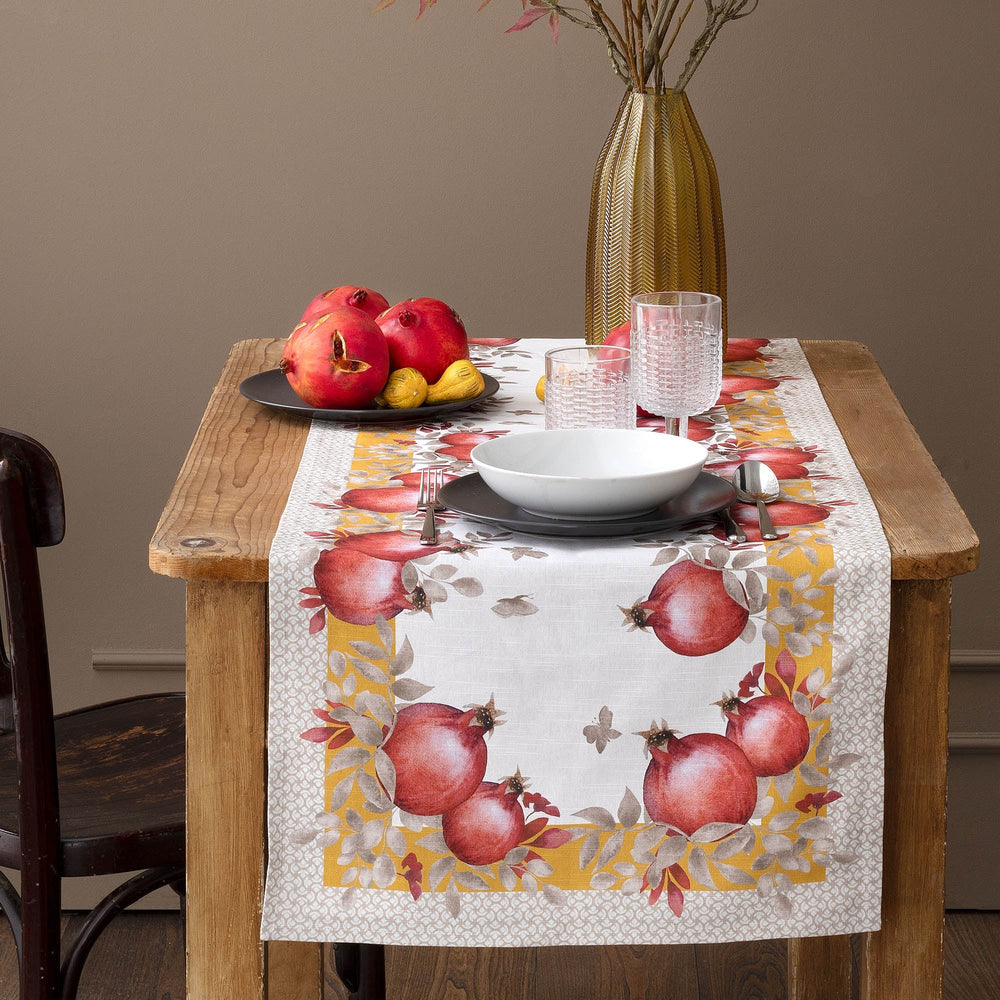 Embrace the spirit of abundance and celebrate the beauty of fall with this delightful Table Runner with Vibrant Pomegranate Print. Order yours today!