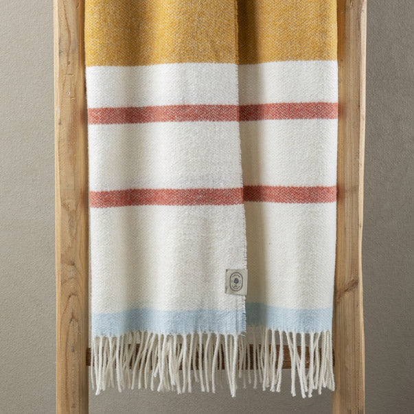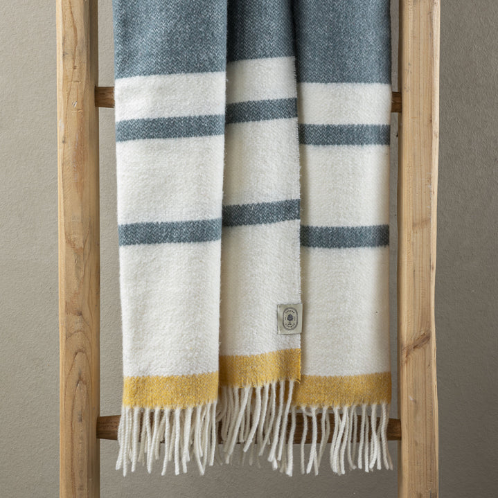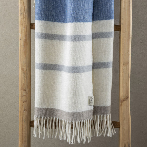 Dimensions: 51x71 inches with fringes. Materials: 40% recycled cotton, 30% recycled wool, 15% recycled polyamide, 15% recycled polycarbonate.Â